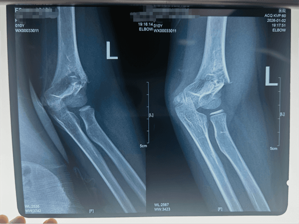 时间就是生机,莹莹从受伤到抵达医院不到2小时,这一“黄金救治窗口”为后续治疗奠定了良好基础。小儿外科接诊后,立即开展细致检查,发现莹莹左肘肿胀明显,呈半屈曲保护姿态,可触及骨摩擦感,肘后三角关系改变,均为肱骨髁上骨折典型体征。幸运的是,莹莹左手“OK”征阴性、虎口区无麻木、桡动脉搏动有力,提示重要神经血管未受损伤,为治疗赢得关键契机,X线片也证实为“左肱骨髁上骨折”。