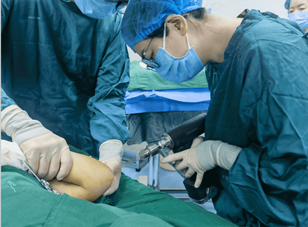 肱骨髁上骨折是儿童最常见的肘部骨折之一,手术治疗须兼顾骨折复位精度与骨骺(生长板)保护,直接关乎莹莹未来骨骼发育。莹莹的微创精准手术在全身麻醉下开展,手术团队在C臂透视机精准引导下,进行“毫米级”精细操作:无需大开刀口,仅通过皮肤外对抗牵引和手法复位,便将移位骨折端完美对合;随后将细如发丝的克氏针经皮穿入交叉固定骨折块,全程出血极少,并通过关节造影确认关节面平整。该微创术式最大程度降低了对周围软组织及骨骺的损伤,为莹莹远期功能完全恢复提供有力保障。
