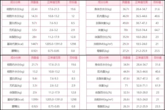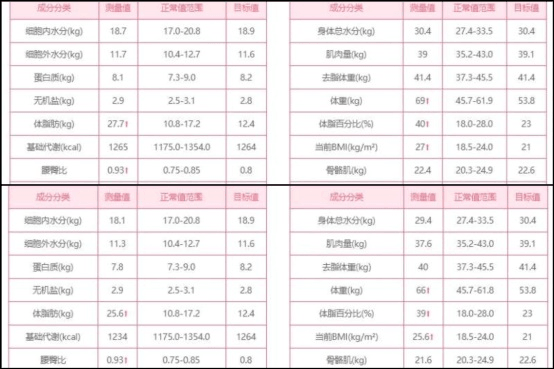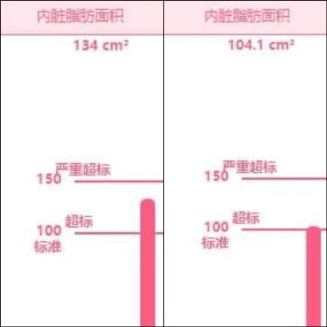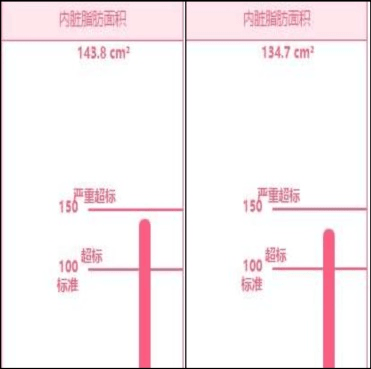 相比而言,小李(化名)的体重由69kg下降至66kg,体脂肪由27.7kg下降至25.6kg,体脂肪百分比由40%下降39%,肌肉量由39kg下降至37.6kg,内脏脂肪面积由143.8cm²下降至134.7cm²。