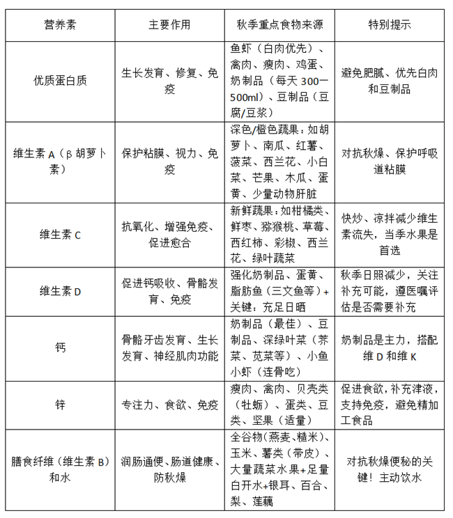 暑热渐消,凉风送爽,立秋是孩子成长的黄金期。如何科学补充营养,增强体质,抵御秋燥?宝鸡市儿童医院消化营养科唐红强主任提醒:儿童消化系统娇嫩,秋季进补需“均衡营养、滋阴润燥”,避免盲目“贴膘”导致积食或内热。