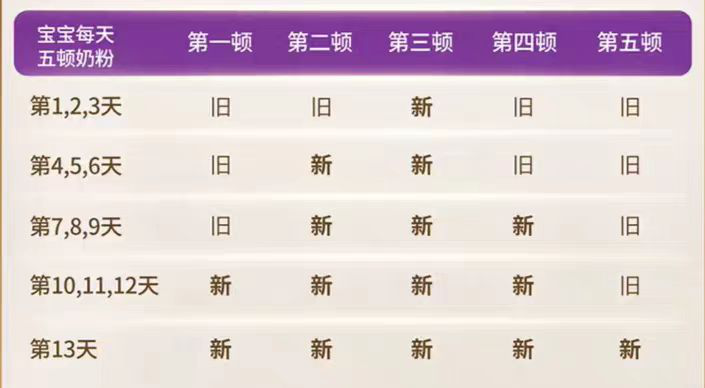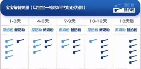 后者可选择白天(不建议选择晚上,以免刚开始出现肠胃不适应影响夜间睡眠)中间的某一顿完全用新奶粉,每3天为一个观察周期,逐渐增加新配方粉的顿数即可。具体操作如图二(以宝宝每天五顿奶粉为例)。