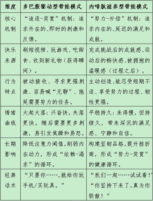 结语:我们要帮助孩子获得的,不是短暂的“嗨皮”(多巴胺),而是长久的“幸福”(内啡肽)。这就像零食和主食的区别。零食好吃但不能当饭吃。我们的目标,是让孩子爱上“吃饭”,从努力、坚持和爱中获得主要能量,这样他们才能成长为一个内心强大、乐观坚韧的人。