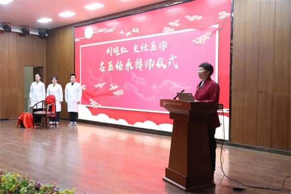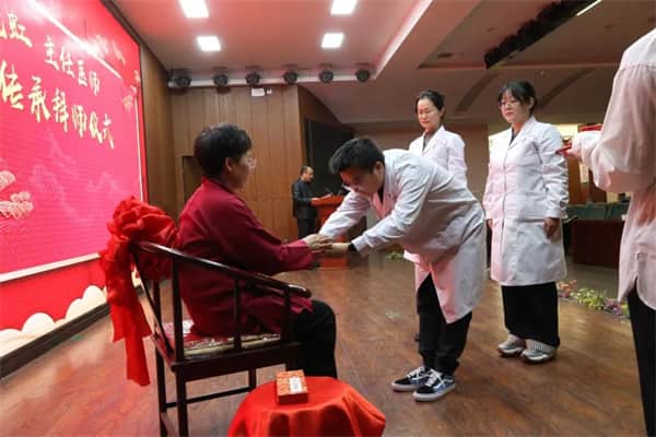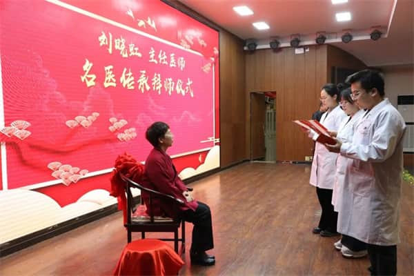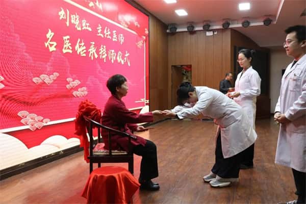 仪式简朴而庄重,院领导及各科室主任现场见证了这一传承时刻。三名弟子依次向指导老师刘晓虹呈递拜师帖、行拜师礼、敬拜师茶,一系列传统礼仪尽显对中医老师的敬重与传承岐黄之术的赤诚。弟子们齐声诵读拜师帖,字字铿锵有力,不仅表达了对老师的感恩之情,更立下了精研医术、传承国粹的坚定誓言。