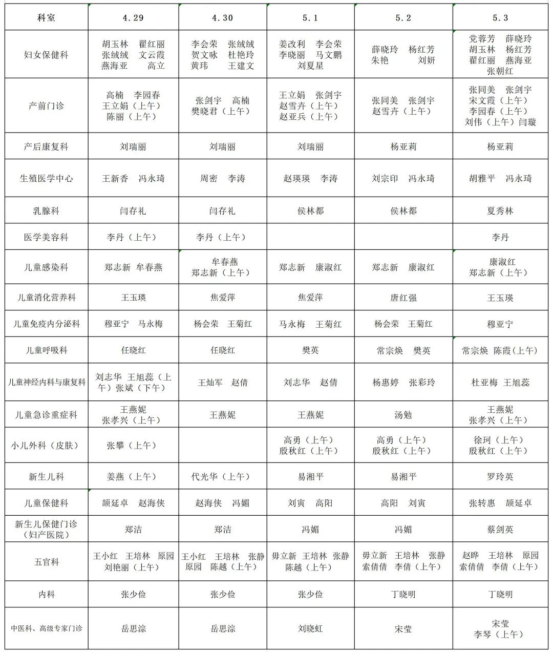 劳动节门诊医生出诊表