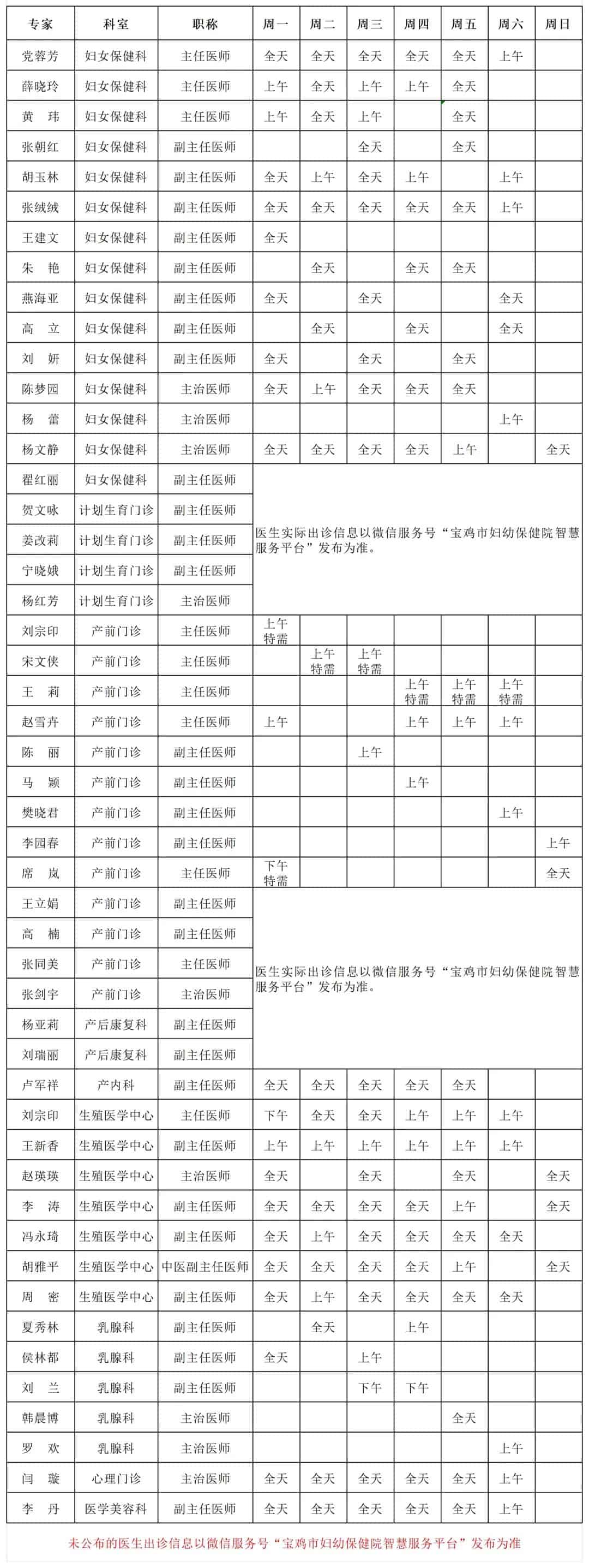 医生实际出诊信息以微信服务号“宝鸡市妇幼保健院智慧服务平台”发布为准。